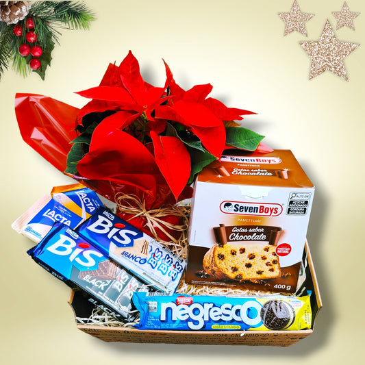 Cesta de natal c/ vinho, flores, panettone, chocolates e biscoitos.