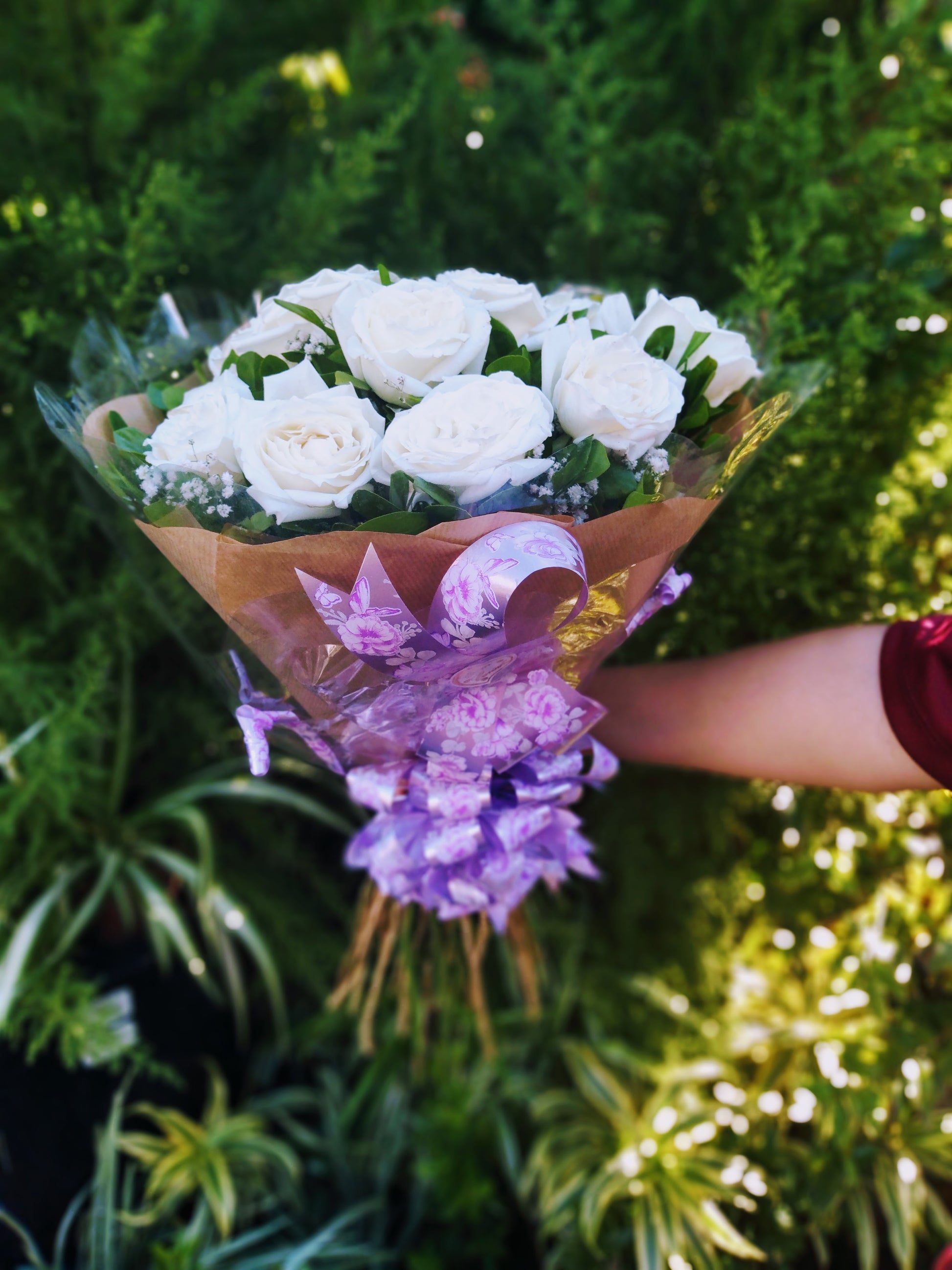 Este buquê vem com 12 unidades de rosas na cor branca, murta, gipson, embalado para presente com papel, laço e cartão (mande os dizeres do cartão pra gente por WhatsApp).