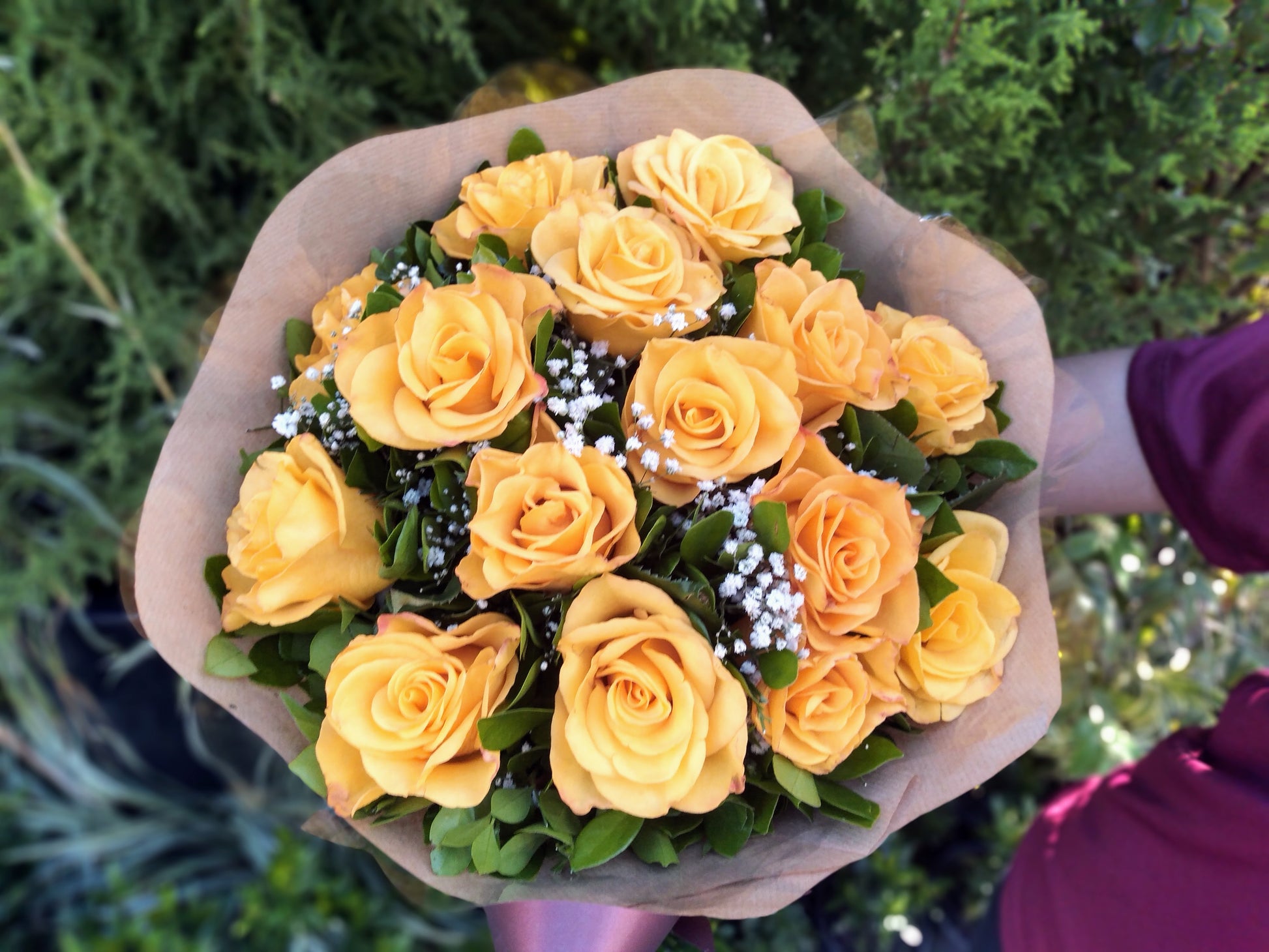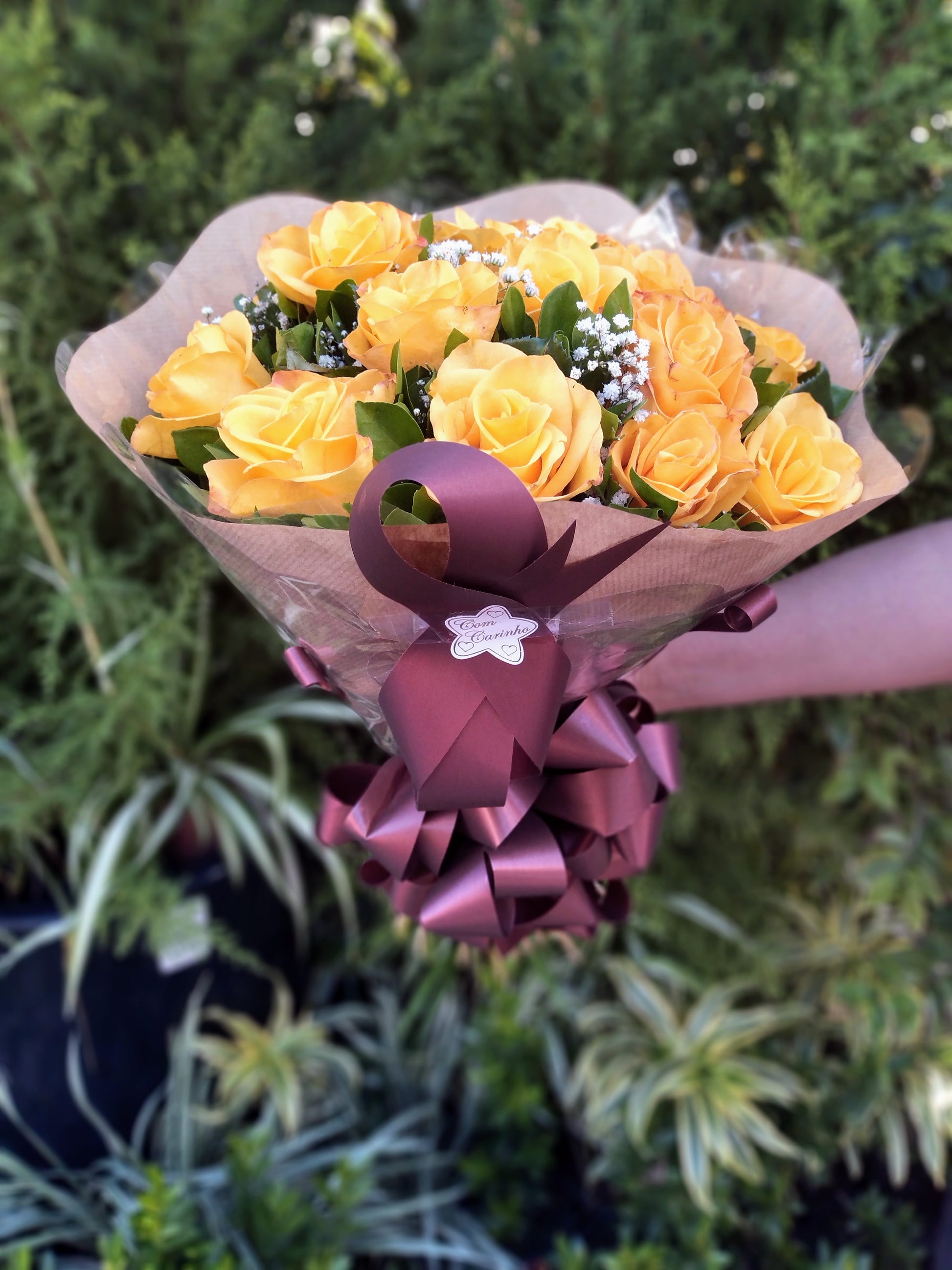 Este buquê vem com 12 unidades de rosas na cor amarela, murta, gipson, embalado para presente com papel, laço e cartão (mande os dizeres do cartão pra gente por WhatsApp).